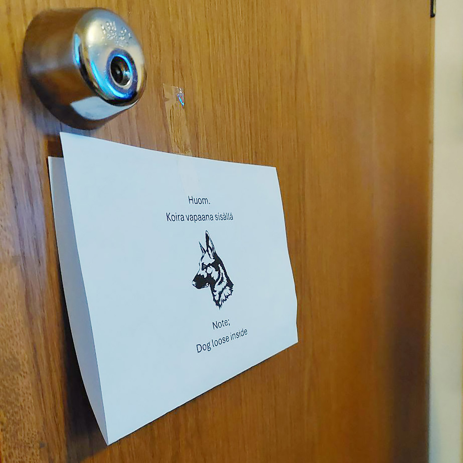 Tapasin isä Andersin pappilan ovella. Hän johdatti minut lyhyen käytävän päähän, jonka ovessa luki: “Huom. Koira vapaana sisällä, Note; Dog loose inside.”